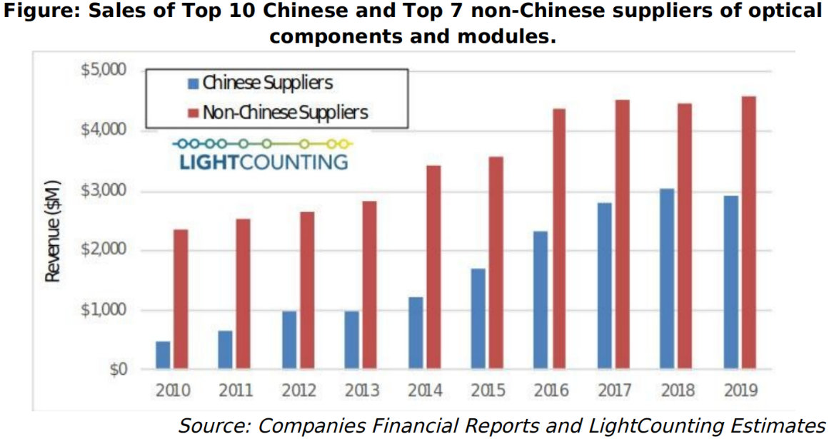 As shown in the chart below, the sales of Chinese optical suppliers exceeded US$500 million by 2010. It then increased to US$3 billion by 2018, before slightly declining in 2019.