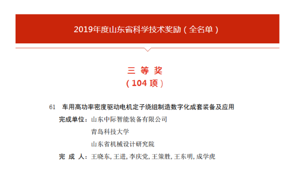 近日,山東省人民政府【魯政發(fā)〔2019〕16號】通知發(fā)布,省政府決定,對為我省科學技術(shù)進步、經(jīng)濟社會發(fā)展作出突出貢獻的科學技術(shù)人員和組織給予獎勵。由山東中際智能裝備有限公司牽頭完成的“車用高功率密度驅(qū)動電機定子繞組制造數(shù)字化成套裝備及應用”項目獲山東省科技進步獎三等獎。